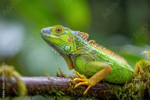 © Alina, Fototapeta premium Beautiful iguana on blurred green background