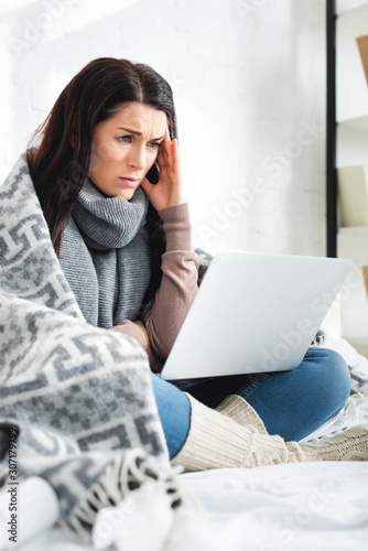 Fototapeta premium beautiful ill woman with headache having online consultation with doctor on laptop
