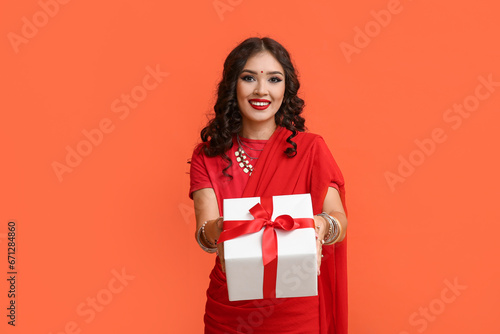 Fototapeta premium Beautiful Indian woman in sari with gift box on orange background