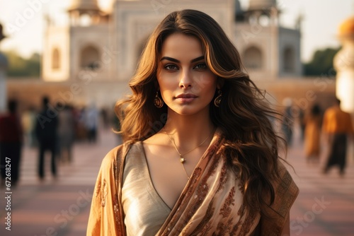 Fototapeta premium Beautiful Indian woman model in sari traditional dress with the Taj Mahal Palace in the background.