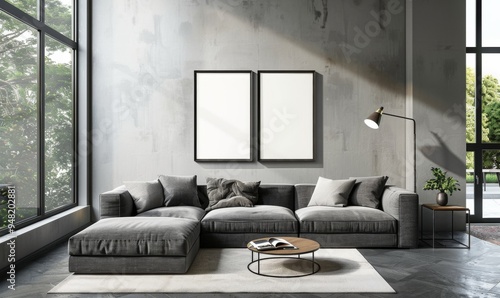 Fototapeta premium beautiful interior design furniture with mockup poster artwork with border...