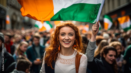 Fototapeta premium Beautiful Irish Girl Celebrating St. Patrick's Day in Dublin, Patriotic Pride...