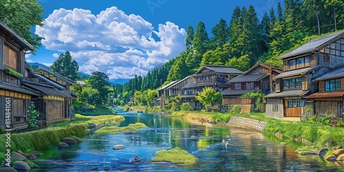 Fototapeta premium beautiful Japan rural village beside river in sunny day, anime illustration...