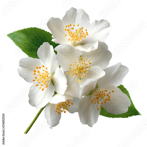 © Shipons Creative, Obraz premium Beautiful jasmine blossoms with vibrant yellow stamens and green leaves on transparent background