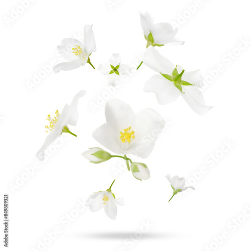 © New Africa, Obraz premium Beautiful jasmine flowers in air on white background