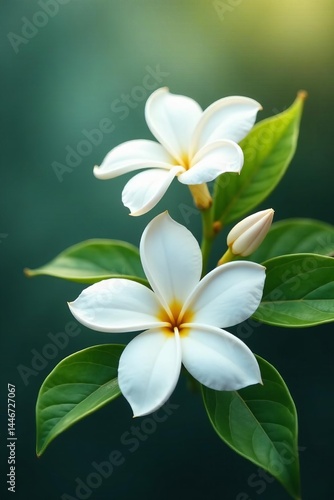 © Teepanun, Fototapeta premium Beautiful jasmine flowers with delicate petals and green leaves, petals, flowers, beauty
