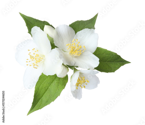 © New Africa, Obraz premium Beautiful jasmine flowers with green leaves isolated on white