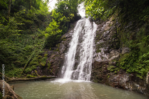 © Дмитрий Горелкин, Fototapeta premium Beautiful Kapnistavi waterfall in the green forest. Adjara, Georgia