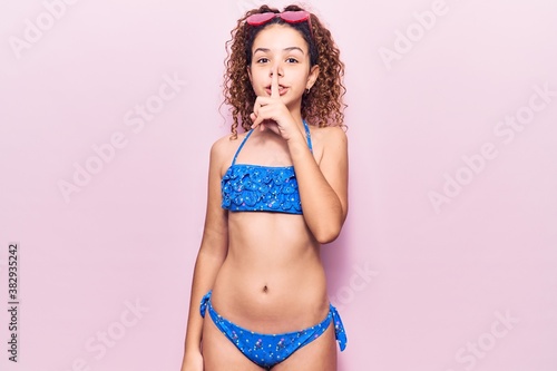 Naklejka premium Beautiful kid girl with curly hair wearing bikini and sunglasses asking to be quiet with finger on lips. silence and secret concept.