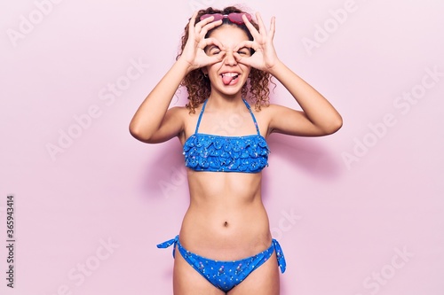© Krakenimages.com, Naklejka premium Beautiful kid girl with curly hair wearing bikini and sunglasses doing ok gesture like binoculars sticking tongue out, eyes looking through fingers. crazy expression.
