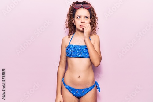 © Krakenimages.com, Naklejka premium Beautiful kid girl with curly hair wearing bikini and sunglasses looking stressed and nervous with hands on mouth biting nails. anxiety problem.