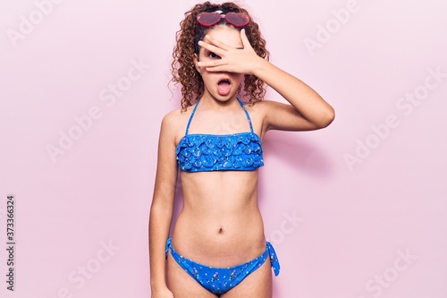 Naklejka premium Beautiful kid girl with curly hair wearing bikini and sunglasses peeking in shock covering face and eyes with hand, looking through fingers with embarrassed expression.
