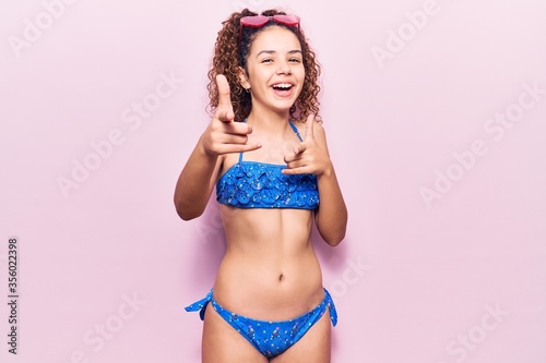 Naklejka premium Beautiful kid girl with curly hair wearing bikini and sunglasses pointing fingers to camera with happy and funny face. good energy and vibes.