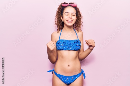 Naklejka premium Beautiful kid girl with curly hair wearing bikini and sunglasses very happy and excited doing winner gesture with arms raised, smiling and screaming for success. celebration concept.