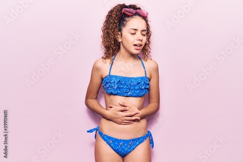 Naklejka premium Beautiful kid girl with curly hair wearing bikini and sunglasses with hand on stomach because nausea, painful disease feeling unwell. ache concept.