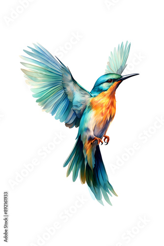 © pawczar, Obraz premium Beautiful kingfisher with beak flies with spread wings, watercolor painting clipart