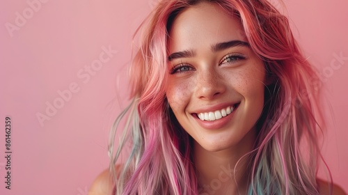 Fototapeta premium Beautiful korean woman smilling white teeth, 25 year old, rainbow hair and...