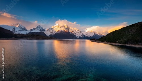 © Tierra, Fototapeta premium beautiful lake at sunset with snow capped mountains in the background
