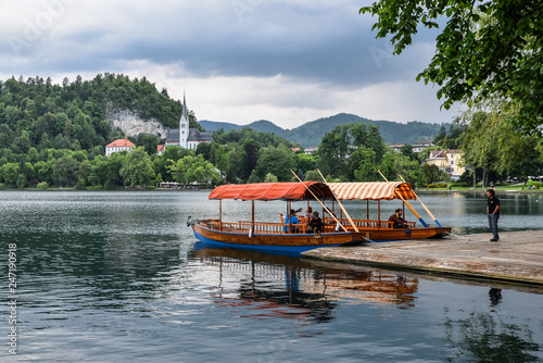 Naklejka premium Beautiful Lake Bled in the Julian Alps and two old wooden boats. Mountains, clear aquamarine water, tourist boat, lake and dramatic blue sky.