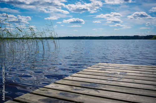 Fototapeta premium Beautiful lake view with wooden pier on the lake