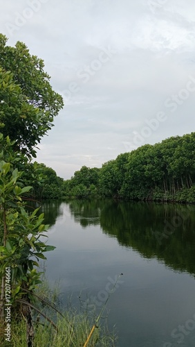 © Andreas, Fototapeta premium beautiful lake with green trees and clear sky