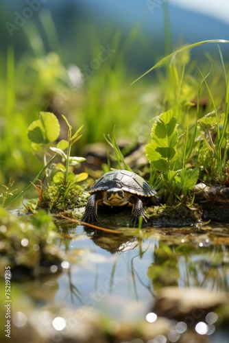 © Nikolai, Fototapeta premium Beautiful land turtle in green grass habitat near tranquil puddle wildlife scenery