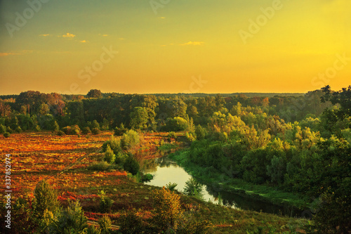 © Ruslan, Fototapeta premium beautiful landscape dawn with clouds overlooking a forest field and a river