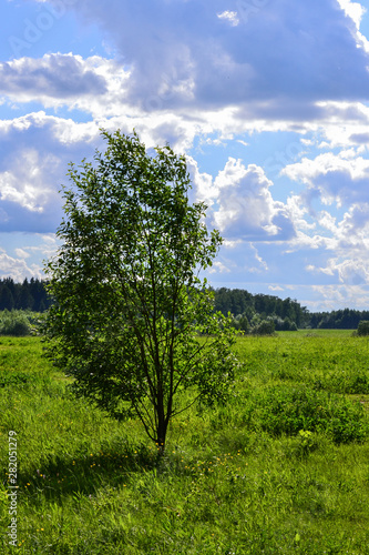 © Aleksandr, Obraz premium Beautiful landscape. Field of green grass tree. Blue sky with clouds. Russia, Moscow region