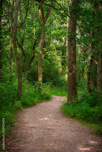 Fototapeta premium Beautiful landscape image of footpath winding through vibrant green forest in...