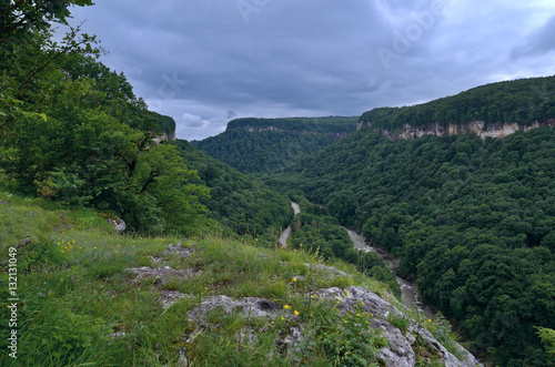 Fototapeta premium Beautiful landscape in a mountain valley. Summer green foliage o