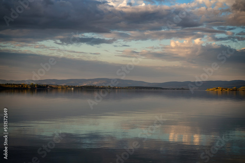 Fototapeta premium Beautiful landscape. Lake water surface with reflection of clouds in the water