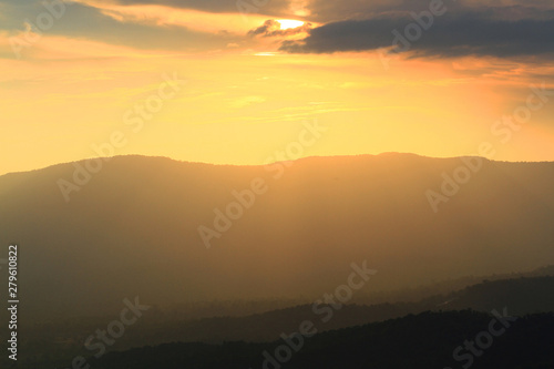 © cocorattanakorn, Fototapeta premium Beautiful landscape layers of mountain and Misty on hill valley in golden twilight of sunset at Thailand