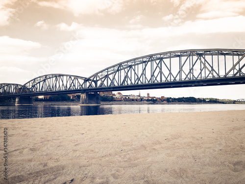 Naklejka premium beautiful landscape of a European city metal bridge across the river near the beach