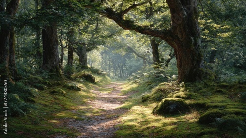 Naklejka premium Beautiful landscape of a forest with a dirt path winding through it. the path is surrounded by tall trees with thick trunks and lush green foliage.