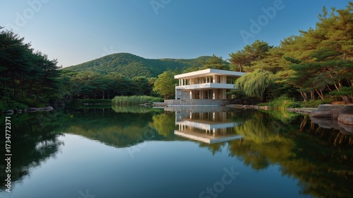 Fototapeta premium Beautiful landscape of a lake with a modern house in the background. the lake is surrounded by lush greenery and trees, and the reflection of the house can be seen on the water's surface.