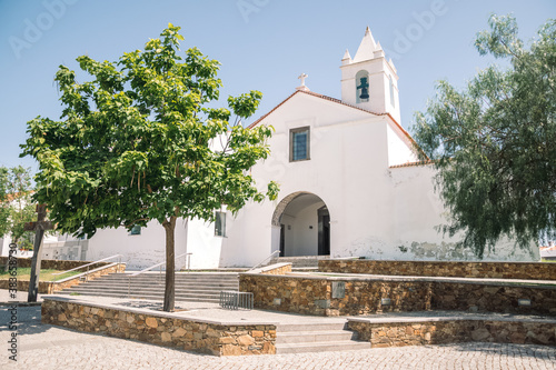 Fototapeta premium beautiful landscape of a small church built of white stone. little tree growing in front of the church. church in portugal. church with a tower with bells