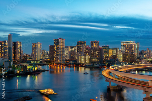 © Alisa, Obraz premium Beautiful landscape of architecture of famous modern district Tokyo with bridge, road and sea, Japan travel background