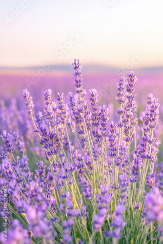© Myroslava, Naklejka premium Beautiful landscape of blooming lavender field with mountains in the background