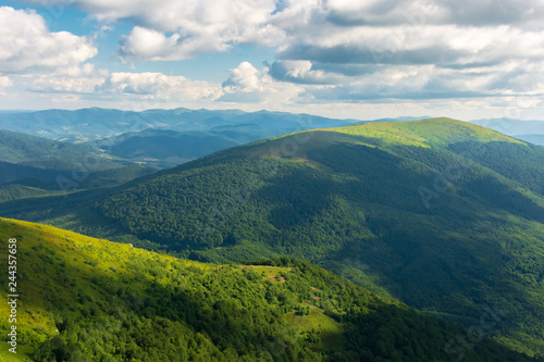 Fototapeta premium beautiful landscape of carpathian mountains. grassy alpine meadows, deep valleys. wonderful sunny weather at sunset in summer. fluffy clouds on the blue sky