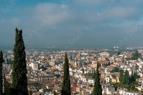 © Tania, Fototapeta premium Beautiful landscape of Granada, Spain. Blue sky, tall trees and charming buildings from above.