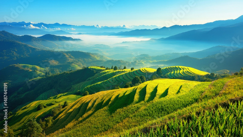 © Designbd25, Fototapeta premium Beautiful landscape of lush green rice terraces with misty mountains under a bright blue sky
