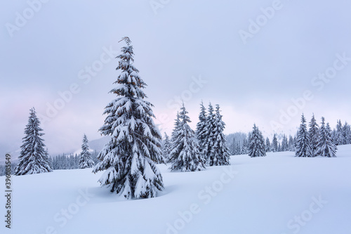 Fototapeta premium Beautiful landscape on the cold winter day. High mountain. Pine trees in the snowdrifts. Lawn and forests. Snowy background. Nature scenery. Location place the Carpathian, Ukraine, Europe.