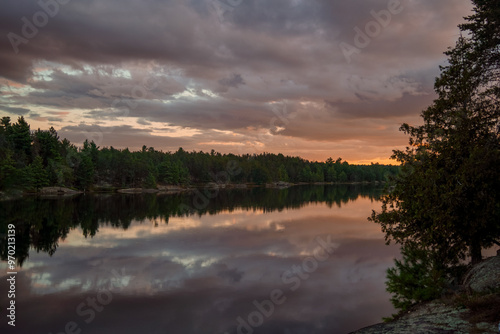 © Ilona, Fototapeta premium beautiful landscape on the lake and with forest and sunset colorful sky