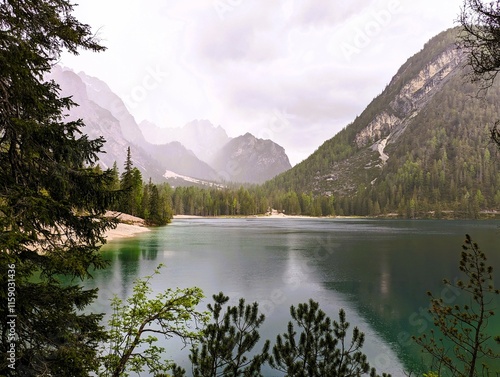 Naklejka premium Beautiful landscape panorama of the Pragser Wildsee, Lake Prags, Lake Braies, Lago di Braies, Pragser Wildsee in the Dolomites in South Tyrol, Italy. Hiking and holidays in South Tyrol.