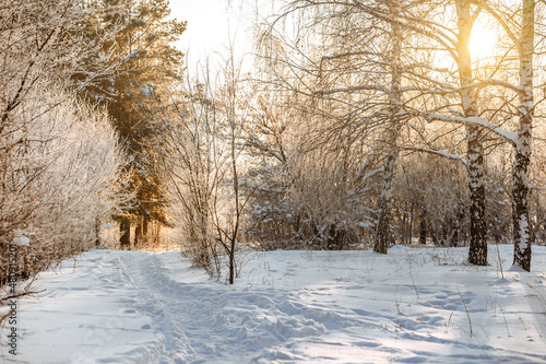 Fototapeta premium Beautiful landscape path between trees in winter snow forest