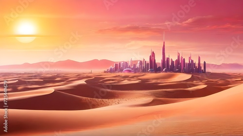Obraz premium Beautiful Landscape Pink Sand Desert Sunset Background Futuristic City