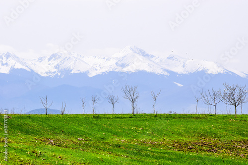 © Daniel, Fototapeta premium Beautiful landscape view a panoramic view of the Retezat mountains, Carpathians, Romania. View of the snowy peaks behind the colorful fields.
