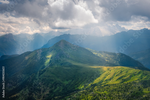 © Martin M303, Fototapeta premium Beautiful landscape view of Dolomites meadows and mountains with dramatic sunrays