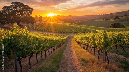 © Panuwat, Naklejka premium Beautiful landscape vineyard sunset sky filled orange yellow A panoramic scene