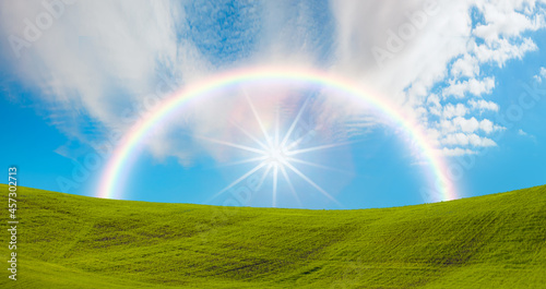 © muratart, Naklejka premium Beautiful landscape with green grass field amazing rainbow in the background